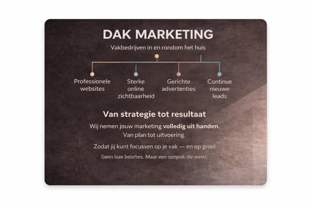 Bij DAK Marketing geloven we dat vakmensen moeten doen waar ze goed in zijn: bouwen, renoveren en leveren van topkwaliteit.